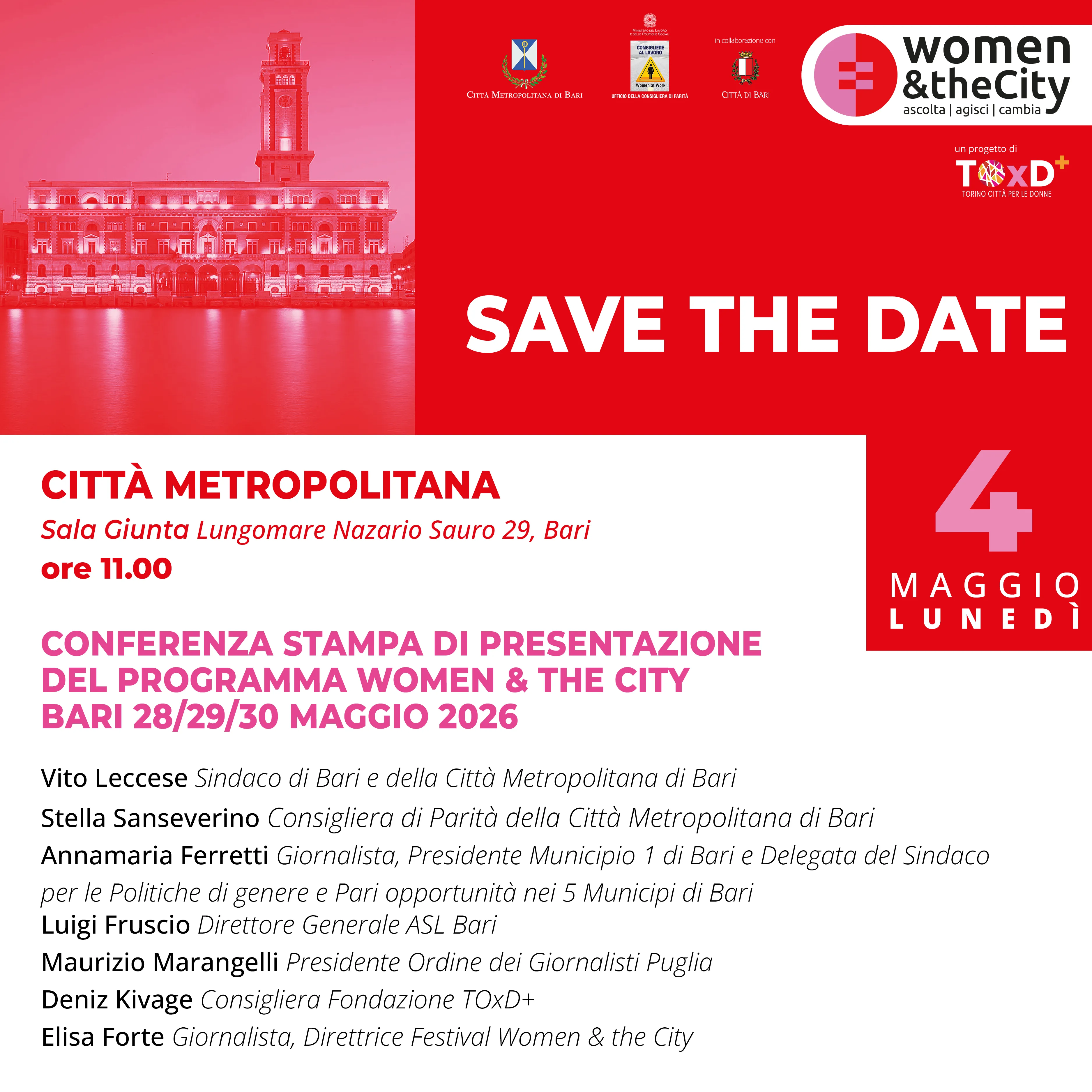 La seconda edizione di Women & the City si è svolta dal 9 al 13 ottobre 2024. Incontri, panel e laboratori hanno attraversato la città coinvolgendo chi si occupa di cultura, impresa, educazione, attivismo e amministrazione pubblica. Si è parlato di linguaggio inclusivo, spazi urbani, Stem, welfare, emancipazione economica e rappresentazione nel mondo del lavoro, nelle cariche istituzionali e nella politica.